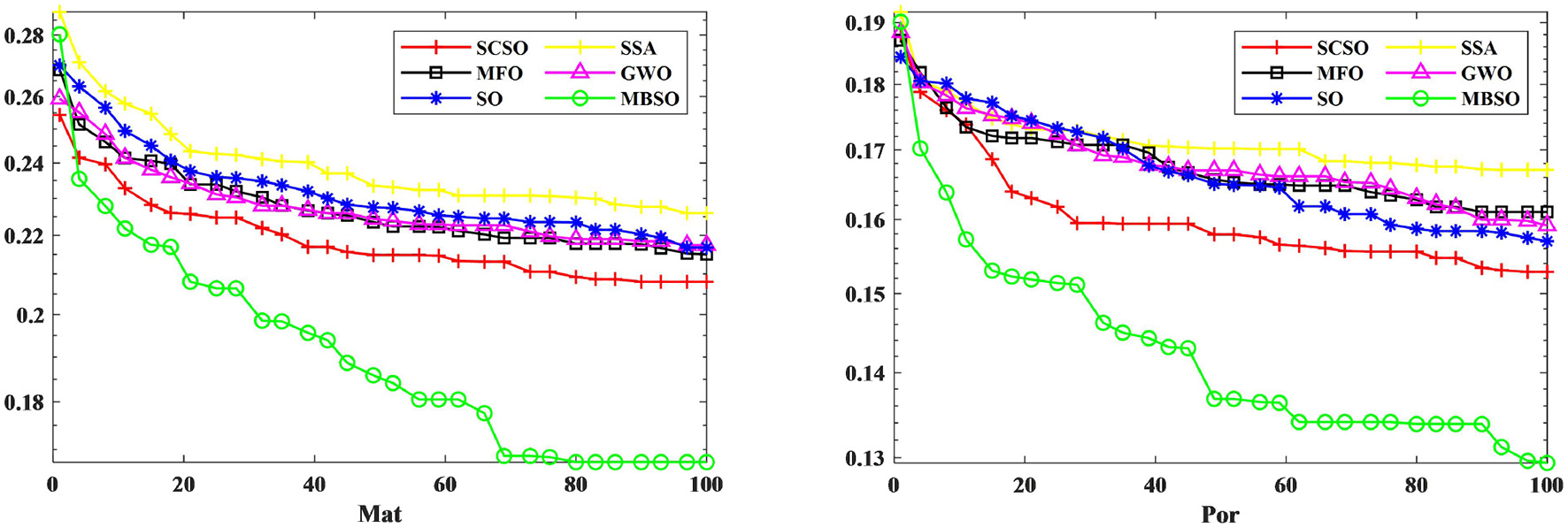 (2) A binary MBSO-based feature selection model is proposed to verify the superior performance of the MBSO model by comparing it with five feature selection algorithms, where the accuracy rate, the quantity of the selected features and the fitness value are employed as the evaluation metrics. And 7 features were selected from 32 student features, which were completely superior to the other five feature selection algorithms.