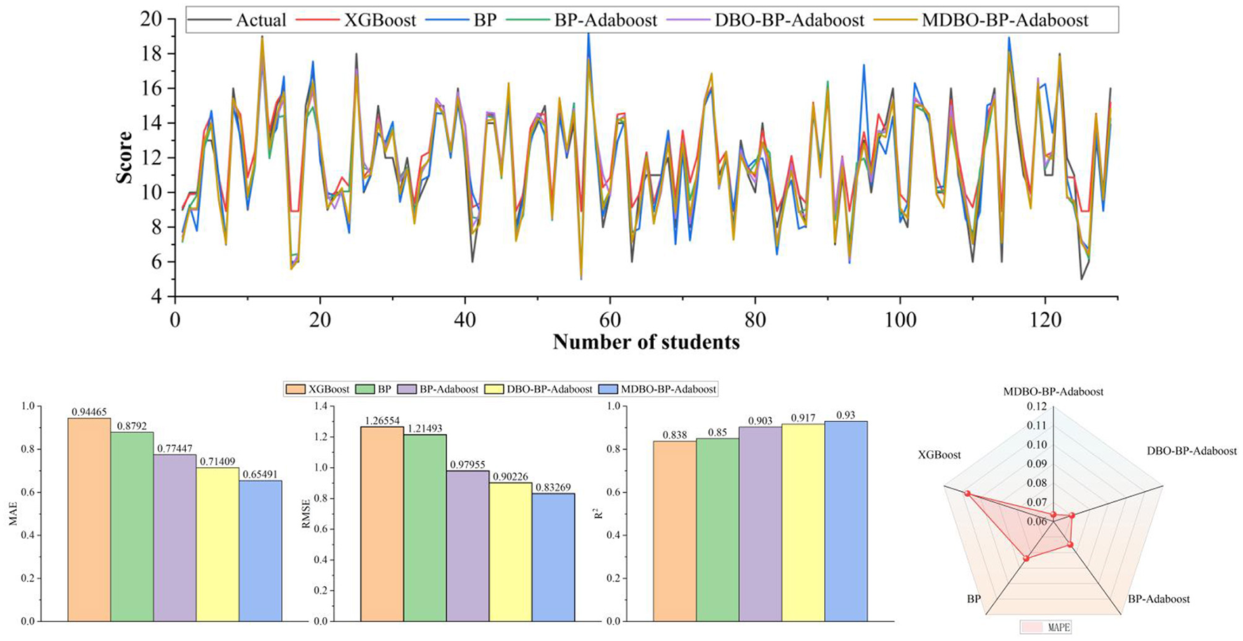 (4) Based on the above research results, the MBSO feature selection model can select features with strong correlation with students, while the MDBO validated by the benchmark test functions and Wilcoxon rank sum test can accurately optimize the weights and thresholds of the BP network. After Adaboost integration, it can achieve the prediction of middle school students' grades.