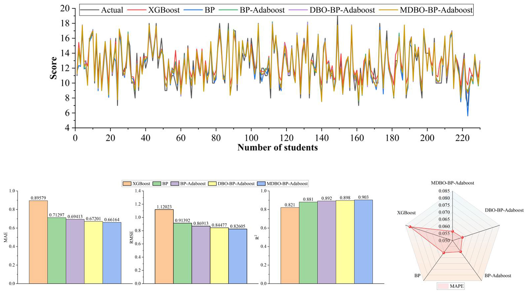 Predictions of student performance are important to the education system as a whole, helping students to know how their learning is changing and adjusting teachers' and school policymakers' plans for their future growth. However, selecting meaningful features from the huge amount of educational data is challenging, so the dimensionality of student achievement features needs to be reduced. Based on this motivation, this paper proposes an improved Binary Snake Optimizer (MBSO) as a wrapped feature selection model, taking the Mat and Por student achievement data in the UCI database as an example, and comparing the MBSO feature selection model with other feature methods, the MBSO is able to select features with strong correlation to the students and the average number of student features selected reaches a minimum of 7.90 and 7.10, which greatly reduces the complexity of student achievement prediction. In addition, we propose the MDBO-BP-Adaboost model to predict students' performance. Firstly, the model incorporates the good point set initialization, triangle wandering strategy and adaptive t-distribution strategy to obtain the Modified Dung Beetle Optimization Algorithm (MDBO), secondly, it uses MDBO to optimize the weights and thresholds of the BP neural network, and lastly, the optimized BP neural network is used as a weak learner for Adaboost. MDBO-BP-Adaboost After comparing with XGBoost, BP, BP-Adaboost, and DBO-BP-Adaboost models, the experimental results show that the R2 on the student achievement dataset is 0.930 and 0.903, respectively, which proves that the proposed MDBO-BP-Adaboost model has a better effect than the other models in the prediction of students' achievement with better results than other models.