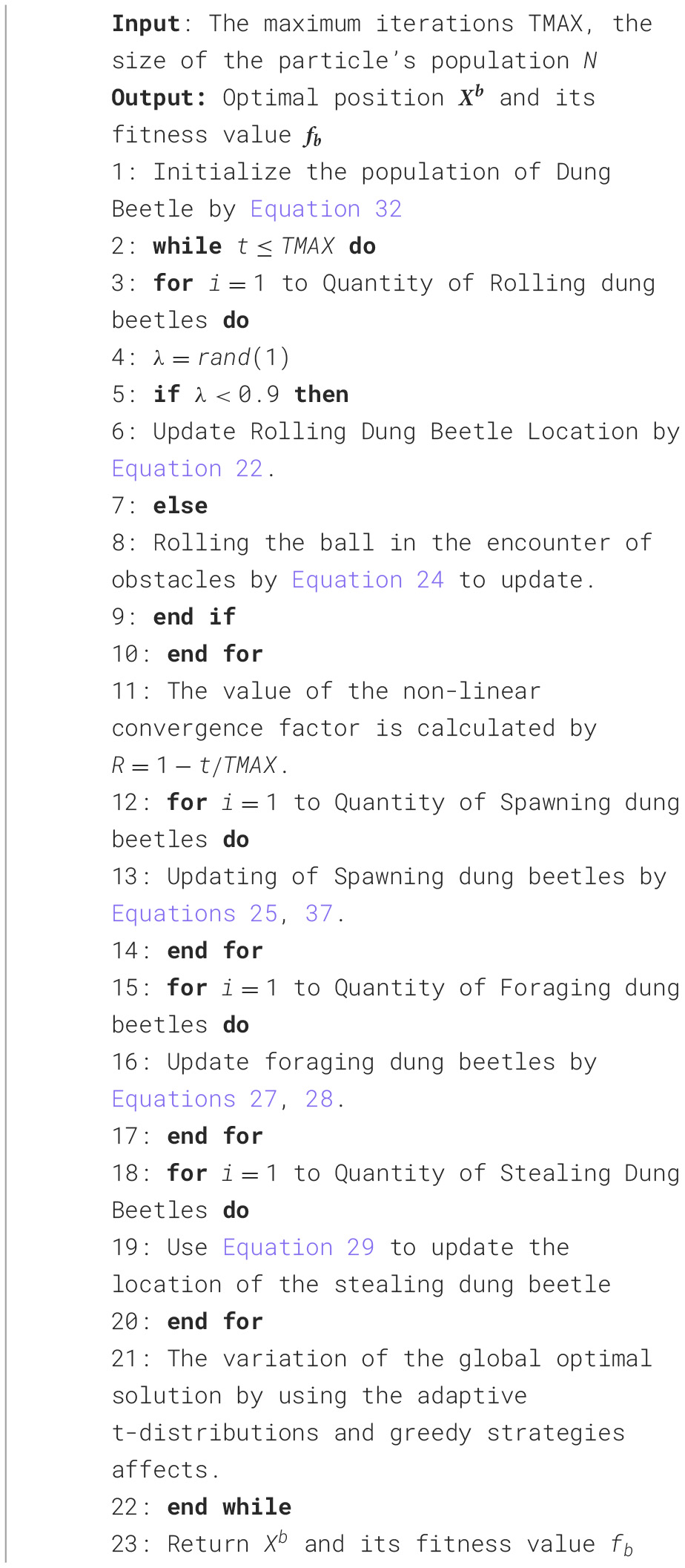 The DBO classifies beetles into four subpopulations, rolling, breeding, foraging, and stealing groups, with a strong optimality-seeking ability and fast convergence (Xue and Shen, 2023). The DBO model is described below.