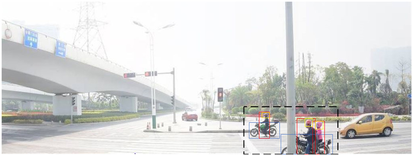 The concerns of third-person privacy is the publication of potentially personally-identifiable information such as a person's face or license plate captured when gathering the road environment imagery. Zhao et al. (2022) propose a privacy-preserving MCS system called CrowdFL by seamlessly integrating federated learning (FL) into MCS. There are many works to be done in terms of privacy protection, such as privacy protection based on differential privacy mechanisms (Zhang et al., 2022; Gao et al., 2022; Wang et al., 2021; Jiang et al., 2021), using blockchain technology to ensure data privacy (Yan et al., 2022), and a distributed data storage method based on compressed sensing technology that ensures data reliability while reducing storage space and communication costs (Zhou et al., 2022), and so on. Non-visual information extraction in our application means image processing can be conducted in the “edge box” and only the information distilled should be delivered to the cloud center. However, the relatively powerful computing capacity of the “edge box” does not allow us to put all image processing steps on the edge side. Therefore, we prefer to use intentional image blurring to solve the privacy concern. Specifically, we fine-tune the YOLOv8 model deployed on the “edge box” to detect everyday traffic participation objects as well as faces and license plates. Then, the detected license plates and pedestrians' faces are blurred for privacy protection. This method is not only technically feasible but also effectively reduces the risk of privacy leakage while retaining sufficient image information for traffic behavior detection and analysis. Moreover, image blurring complies with relevant laws, regulations, and ethical standards, and is more easily understood and accepted by users, thereby enhancing participation in crowdsensing.