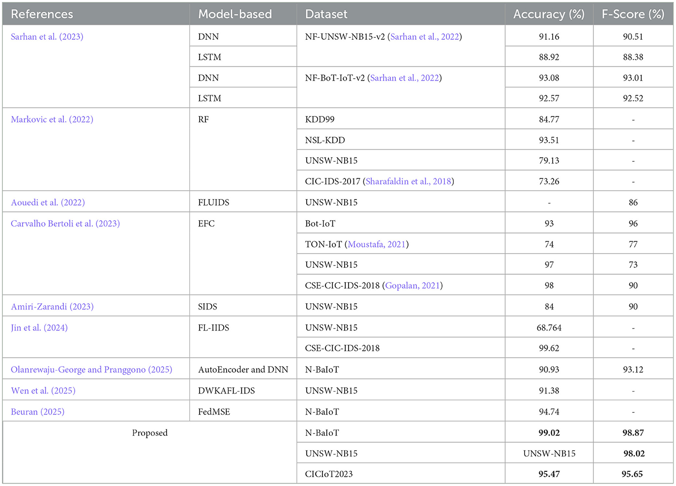 The comparative analysis in this section characterizes recent FL-based solutions in the domain of IDS, which is given in Table 9. Models used FL frameworks under comparison span Deep Neural Networks (DNN), LSTM, Random Forest (RF), as well as specialized frameworks like FLUIDS (Aouedi et al., 2022) and Energy Flow Classifier (EFC) (Carvalho Bertoli et al., 2023) along with SIDS (Amiri-Zarandi, 2023) and FL-IIDS (Jin et al., 2024). Research studies cite a spectrum of datasets, including variations of UNSW-NB15, KDD99, NSL-KDD, CIC-IDS-2017, Bot-IoT, TON-IoT, and CSE-CIC-IDS-2018, which present unique challenges representative of real-world IoT security scenarios. Recently, Olanrewaju-George and Pranggono (2025) introduced the unsupervised AutoEncoder and supervised DNN applied on N-BaIoT dataset, they achieved 90.93% of accuracy. They achieved 93.12% of F-score values, which are low compared to the proposed. The DWKAFL-IDS model (Wen et al., 2025) is tested on CICIDS2017, UNSW-NB15, and NSL-KDD datasets, and it achieved 91.38% of accuracy on the UNSW-NB15 dataset. Furthermore, the FedMSE model (Beuran, 2025) evaluated on the N-BaIoT dataset and achieved 94.74% of accuracy. It is noted from the literature summarized in the Table 9 that the proposed model shows outstanding performance with high accuracy and F-score values across the tested datasets. On the N-BaIoT dataset, the model averages accuracy and F-score values of 99.02% and 98.87%, respectively, clearly indicating superior detection capabilities compared to other models on the same dataset.