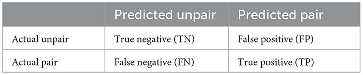 For binary classification problems, understanding and utilizing a confusion matrix as well as critical metrics is key to a thorough assessment. It provides an explicit outline of how classification outcomes can be measured to thoroughly evaluate the model's performance based on metrics like true-positives, true-negatives, false-positives, and false-negatives (see Table 1). A more detailed and informative analysis of the model's strengths and weaknesses allows for a better understanding of model performance in binary classification scenarios. While data imbalances can potentially make accuracy a dubious metric, we were mostly interested in the financial fallout of false negatives where real links would have been misclassified as non-links. Hence, Recall was chosen as our prime evaluation metric to assess how well the model would identify such relevant cases.