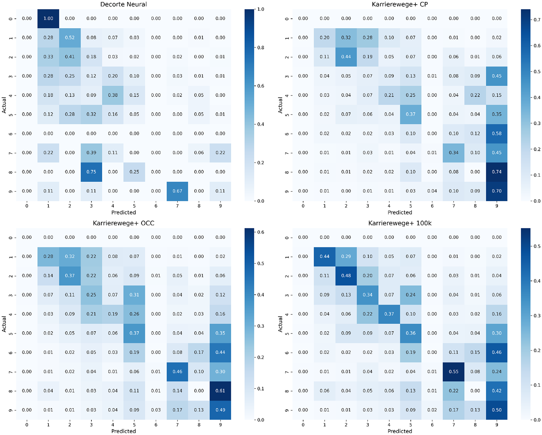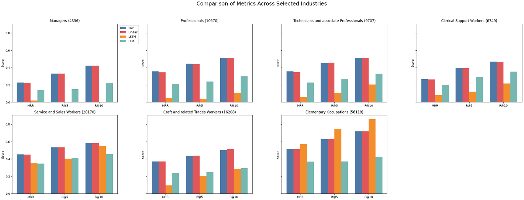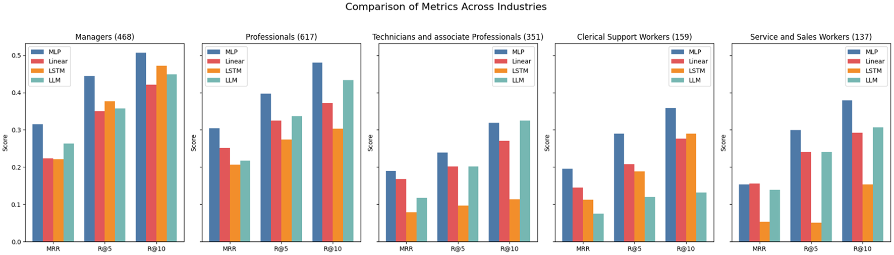 Several broad trends emerge from the results shown in Table 2. First, the KARRIEREWEGE+ datasets generally and unsurprisingly yield higher scores across most models than the DECORTE datasets, which is attributed to the positive impact of a larger training data size. Furthermore, K+ESCO outperforms the free-text datasets, possibly because of the low generation quality of the free-texts. This confirms that using free-text to replicate a real-world scenario is more challenging, where data is more diverse and less structured. In this context, free-text also serves to augment the data, making the model more robust. The robustness does not imply improved quality and in this case, it results in a trade-off in quality. Another plausible explanation is that a more standardized format facilitates pattern learning, particularly for the LSTM (which achieves the highest score here). This also offers an explanation why K+occ has slightly higher scores than K+cp, even though (Senger et al. 2025) showed that K+cp tends to have higher-quality synthetic free-text generations. The difference arises because K+occ is more standardized (only seven paraphrased titles per occupation), whereas K+cp has individually paraphrased career paths. In contrast, for the DECORTE datasets, the free-text variant seems to benefit from additional information not captured in the standardized version, yielding higher scores overall. For DECORTE, the MLP model achieves the highest MRR (25.57), whereas on DECORTE ESCO the best model varies between linear, MLP and LLM depending on the evaluation method. Meanwhile, LSTM shows weaker performance on DECORTE and DECORTE ESCO, likely because these datasets are too small for the LSTM to fully learn patterns. For the two K+occ datasets, MLP tends to perform best (e.g., MRR = 43.58 on K+occ, 43.02 on K+cp).