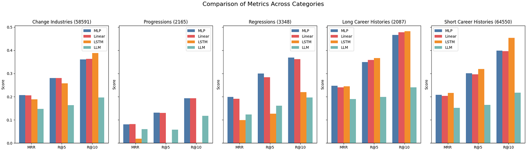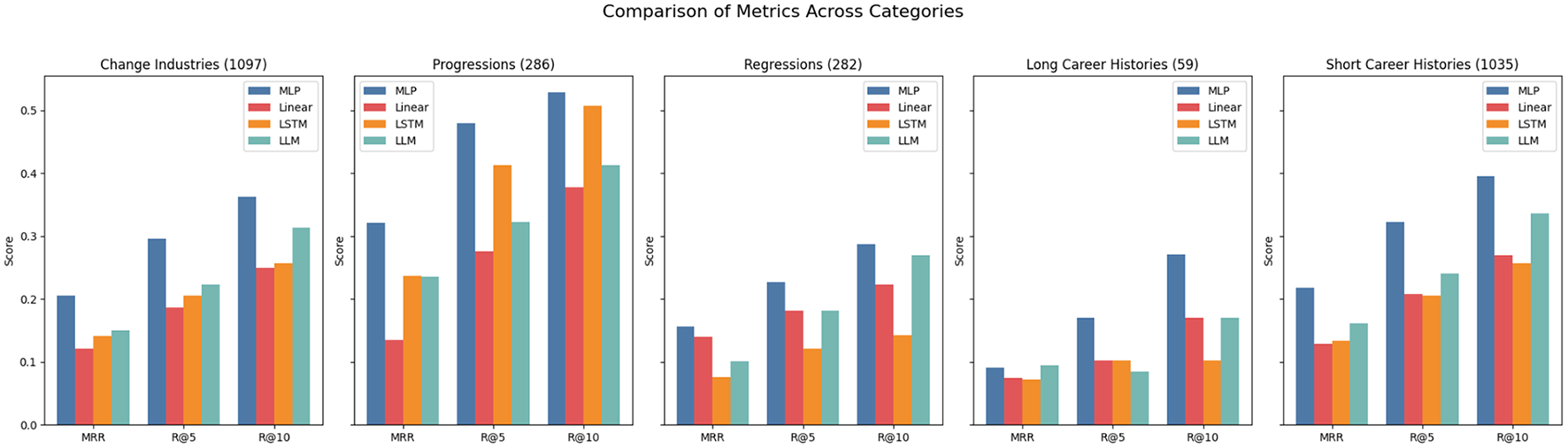 The LSTM and linear transformation approaches serve as strong baselines given their established performance in prior studies. Our MLP model, developed as an extension of the linear approach, introduces non-linear transformations to better capture complex patterns in career path data. Additionally, our LLM approach investigates the potential of large language models for standardized predictions, a previously unexplored area. To improve model performance across all architectures, we adopt the representation learning approach from (Decorte et al. 2023), which provides pretrained text embeddings for job titles and descriptions. The impact of this component is further analyzed in Section 3.2. This comparison allows us to systematically evaluate the performance and robustness of each model under diverse CPP scenarios, providing insights into their practical applicability and limitations. For evaluation we use Rean Reciprocal Rank (MRR), recall@5 (R@5) and recall@10 (R@10). All datasets,4 fine-tuned models 5 and code6 used are made available.