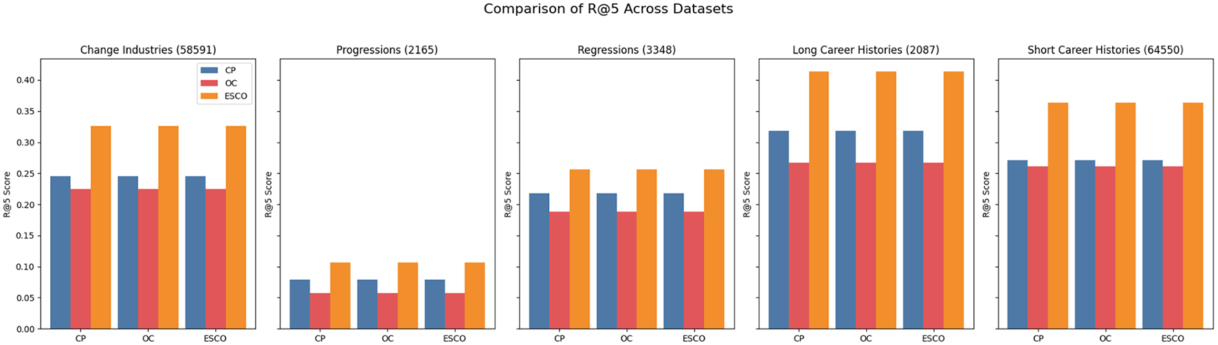 The second dataset, KARRIEREWEGE+ (K+ ESCO) (Senger et al., 2025), is based on anonymized resumes provided by the German Employment Agency.2 This larger dataset contains 100,000 resumes of unemployed individuals in Germany, with standardized job titles from the German Berufenet taxonomy.3 These Berufenet titles were manually linked to ESCO (version 1.2.0). To enrich the data with free-text inputs, two data synthesis methods were employed. For version K+occ, LLAMA 3.1 8b was used to generate seven alternative titles for each ESCO occupation title. For K+cp, the entire sequence of career path titles was directly synthesized. Through quantitative and qualitative analyses, the authors found K+cp to produce higher-quality data. In this study, we examine which synthesis method works best for different models and analyze the influence of errors and patterns in the synthetic data on model performance. We use the official train/validation/test splits provided through Hugging Face for all datasets, which are approximately 80/10/10. Table 1 provides an overview of the different dataset versions used in this study, highlighting their respective sources, sizes, content types, and synthetization methods. Table 1 provides an overview of the different dataset versions used in this study, highlighting their respective sources, sizes, content types, and synthetization methods.