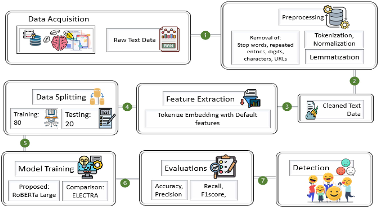 The steps of the research methodology are shown in Figure 3. First, data collection, preprocessing, feature extraction, and model training are performed using state-of-the-art NLP models. The main steps in data preprocessing are text normalization, removal of stop words, lemmatization, and tokenization, which refine the raw textual data. Using transformer-based architectures such as RoBERTa-Large, sentiment classification is performed accurately, capturing signs of emotions and mental health patterns from user-generated content. The proposed framework aims to enhance sentiment detection accuracy by designing a model that leverages contextual embedding's and deep learning-based classification.