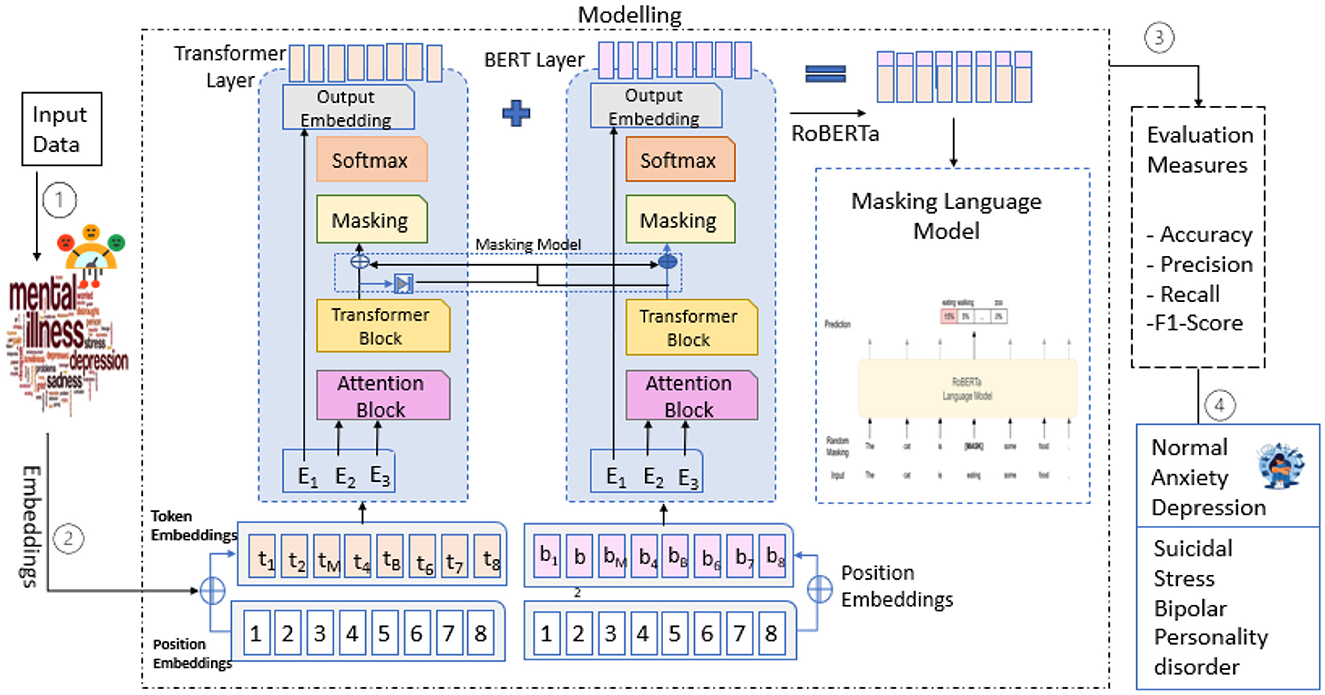 RoBERTa-Large (Robustly Optimized BERT Pretraining Approach) is an improved transformer-based model that enhances the performance of BERT by refining its pretraining strategy. RoBERTa-Large is based on the BERT architecture but does not include the Next Sentence Prediction (NSP) objective. It utilizes larger batch sizes and is trained on more data with dynamic masking, developed by Facebook AI. RoBERTa-Large's performance is rich in a variety of tasks centered on NLP, ranging from sentiment analysis to classification to mental health detection, as it has 24 transformer layers, 16 attention heads, and 355 million parameters (Youngmin et al., 2024). Due to its ability to leverage fine-grained language representations, it is ideal for analyzing complex textual data (e.g., user-generated content about mental health discussions), as proposed by the model architecture defined in Figure 4.