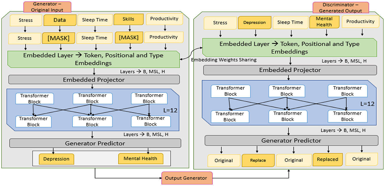 Efficiently learning an Encoder that Classifies Token Replacements Accurately (ELECTRA) uses a pre-training approach called Replaced Token Detection (RTD). ELECTRA does not predict masked tokens; instead, it learns to distinguish masked tokens from plausible replacements that it generates using a small generator network, as shown in the working architecture defined in Figure 5. The ELECTRA model consists of two components: Generator G and Discriminator D. The generator is a small, masked language model (MLM) model that generates the masked tokens of a given input sequence. It produces mismatched versions of input but generates plausible replacements for masked tokens. The generator is trained to replace the tokens with replacements that would be generated by the discriminator, a larger transformer. ELECTRA is more efficient and effective than BERT, as it can evaluate each token in the sequence, not just the masked ones (Ahmed et al., 2024). Both the generator and the discriminator are trained jointly, but only the discriminator is utilized in downstream tasks, such as sentiment analysis.