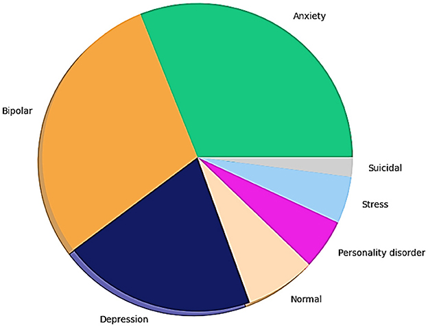 The pie chart in Figure 6 provides crucial insights into the dataset's composition regarding various mental health statuses. The dataset comprised seven classes with the following distribution: normal (16,351 samples), depression (15,404 samples), suicidal ideation (10,653 samples), anxiety (3,888 samples), bipolar disorder (2,877 samples), stress (2,669 samples), and personality disorder (1,201 samples). The most frequently occurring labels are “depression and suicidal tendencies,” suggesting that the collected data are more likely to involve these labels.