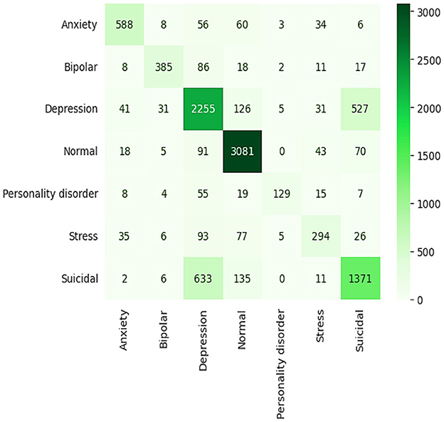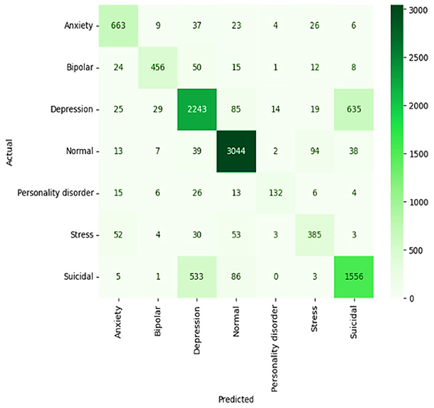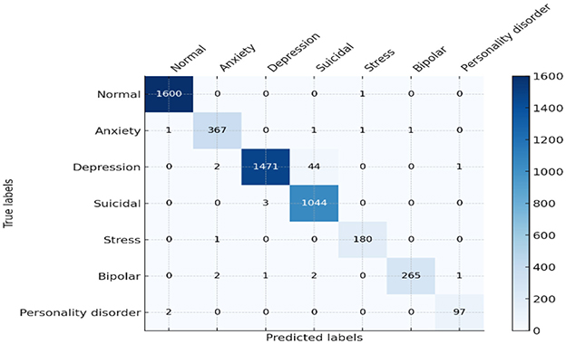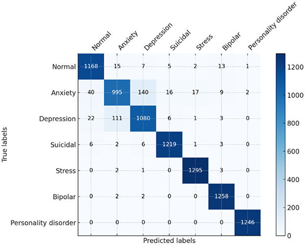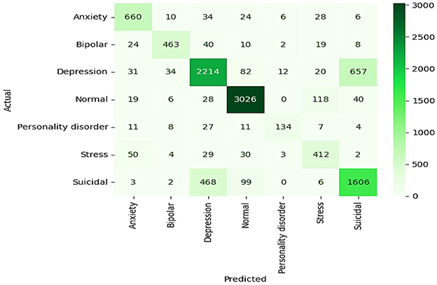 The baseline results of the ELECTRA model in predicting the mental health of students via sentiment analysis prove to be quite strong, with all values of overall accuracy, precision, recall, and F1 score equaling 91%. The model's proficiency in accurately classifying the sentiments in categories such as anxiety, bipolar, depression, normal, personality disorder, stress, and suicidal ideation. Regarding all metrics, this high level of performance indicates that the ELECTRA model effectively interprets small-scale language to identify various mental health conditions, making it an appropriate instrument for early detection and monitoring in academic environments. A detailed view of the model's performance for each class is provided in the confusion matrix. For example, numbers such as “normal” and “suicidal,” which are indicated by the large numbers on the diagonal, indicate a high degree of accuracy of the model in predicting these two states with very few misclassifications, as shown in Figure 11. However, there are unresolved questions as well, for example, between “bipolar” and “depression” or “anxiety” and “stress,” that are highly similar in a clinical or linguistic sense, and which increase the misclassification rates. As a result, this implies that the model, in general, is effective, although it may need to be refined or provided with more training data to better differentiate similar conditions.