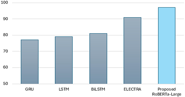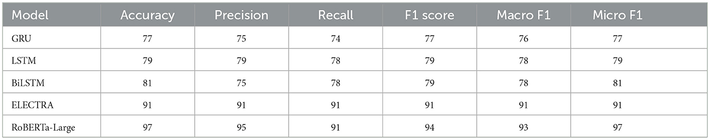 In Table 5, the macro- and micro-average F1 scores allow for a relatively more balanced evaluation in the presence of class imbalance. It is true that traditional RNN-based models, such as GRU, LSTM, and BiLSTM, perform well with macro F1 scores ranging from 76 to 78%, but transformer-based approaches greatly improve this performance. ELECTRA is the most consistent across different metrics, but RoBERTa-Large is the best-performing among all baseline models, with a macro F1 score of 93% and a micro F1 score of 97%, indicating its stronger generalization to minority classes while retaining high overall accuracy.
