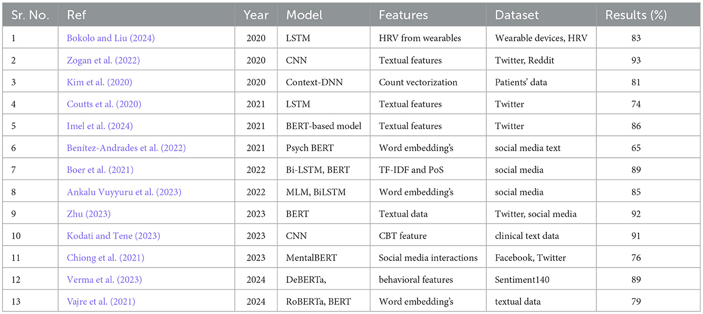 Research over the past few years has demonstrated how deep learning and transformer-based models effectively utilize textual data to predict mental health outcomes. Multiple research projects have applied these sophisticated approaches to sentiment evaluation and mental healthcare forecasts because they show substantial promise for spotting depression, along with anxiety and suicidal risk factors. Within current research on mental health prediction, the main challenges that persist include coping with linguistic diversity in expressions, managing ethical issues, and the need to combine multiple data types. Table 1 presents an analysis of existing studies for a more comprehensive comparative analysis.