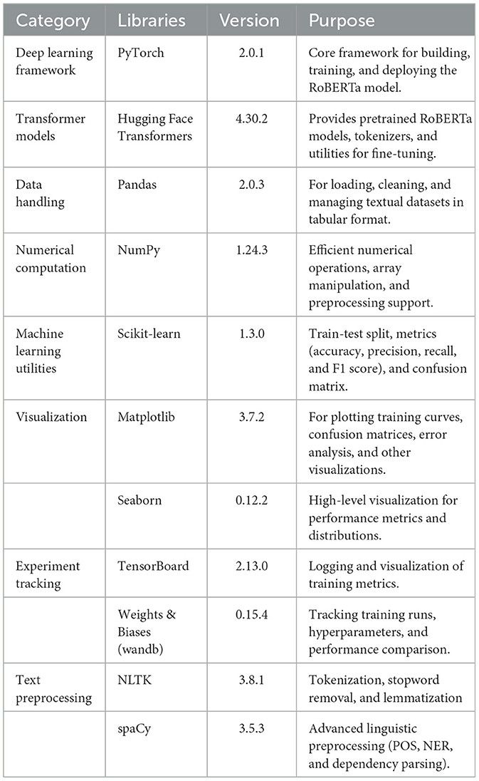 The proposed model was developed and fine-tuned using widely adopted deep learning and NLP libraries, including PyTorch and the Hugging Face Transformers framework. Data handling and preprocessing were performed using Pandas and NumPy, while scikit-learn was utilized for evaluation metrics. Visualization and interpretability were supported through Matplotlib and Seaborn, as summarized in Table 3. The training and evaluation were conducted on a GPU-enabled environment using Google Colab to ensure efficient computation.