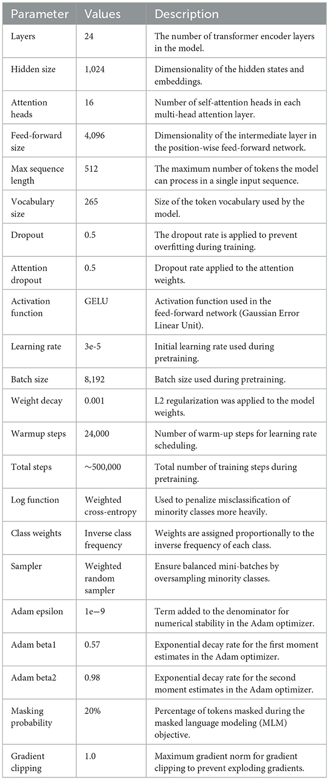The RoBERTa-Large model is characterized by a set of carefully tuned hyperparameters that optimize its performance for natural language processing tasks. Table 4 summarizes the key hyperparameters of the RoBERTa-Large model. To reduce misclassification errors between similar classes, such as depression and bipolar, a weighted cross-entropy loss was used with class-specific weights obtained based on their occurrence frequencies. This hyperparameter tuning ensured that boxes belonging to minority classes have a larger penalty during training, which improves the model's sensitivity toward bipolar instances without affecting performance on depression. The hyperparameters were tuned using a grid search strategy to identify the optimal configuration and enhance the model's generalizability.