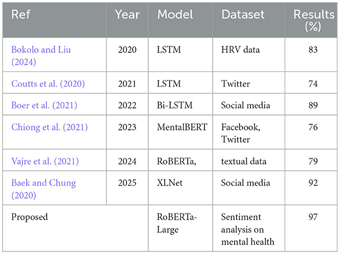 Table 6 presents various feature-based models applied in mental health cases to yield results. A comparative analysis of the proposed RoBERTa-Large model with existing models shows that our model achieves a 97% result in sentiment analysis of mental health, relying on word embedding's. Indeed, this model surpasses other approaches, such as the traditional LSTM, which utilizes HRV from wearable devices, as well as textual features from Twitter, to achieve results of 83% and 74% in earlier applications. Among more advanced models, such as BiLSTM+BERT and other models like MentalBERT and RoBERTa+BERT, which perform well on complex text data and social media interactions, the highest performance achieved is only up to 89% and 79%, respectively. For example, a more recent development, XLNet, which utilizes word embedding's for social text-based communication, was more effective than RoBERTa-Large, achieving an outcome of 92%. Based on the above, the RoBERTa-Large model is selected for its superior performance, as well as its effective handling of word embedding's and robust training, which likely corresponds to a deeper, more nuanced understanding of language context for mental health. This makes it a brilliant tool in the domain of mental health diagnostics and sentiment analysis.