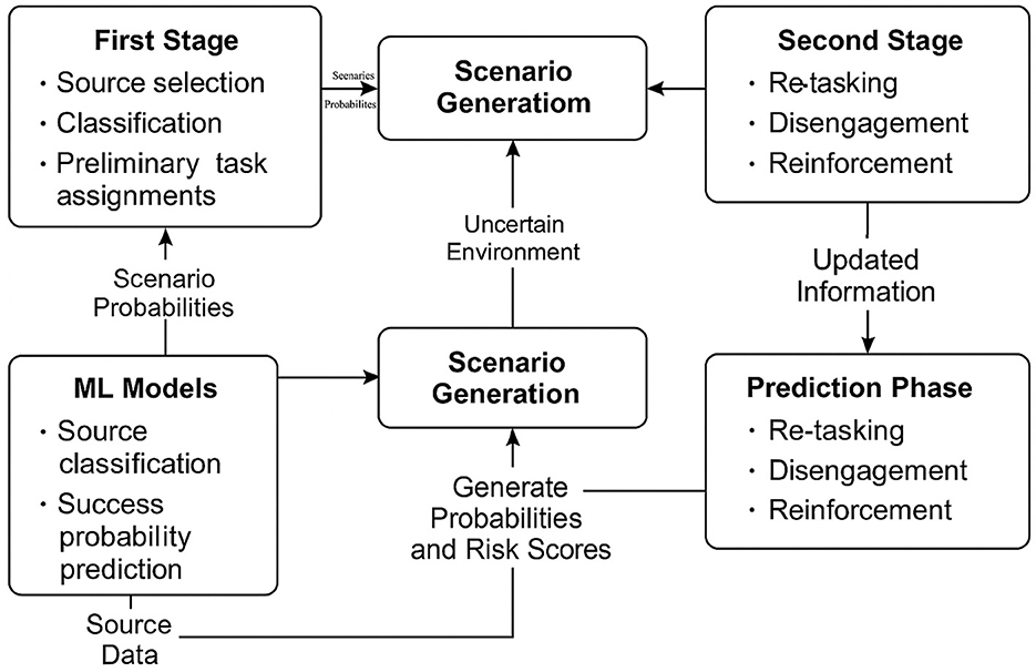 This dual structure enables the intelligence decision-making process to be modeled sequentially, capturing both foresight and adaptability. In the first stage, strategic tasking decisions are made based on ML predictions of source reliability. In the second stage, as outcomes unfold or real-time updates are received, tactical adjustments such as reallocation, withdrawal, or reinforcement are made. This aligns with realistic command-and-control dynamics in national security operations where early decisions must be made under uncertainty but revised as ground intelligence evolves (Bodur and Luedtke, 2017).