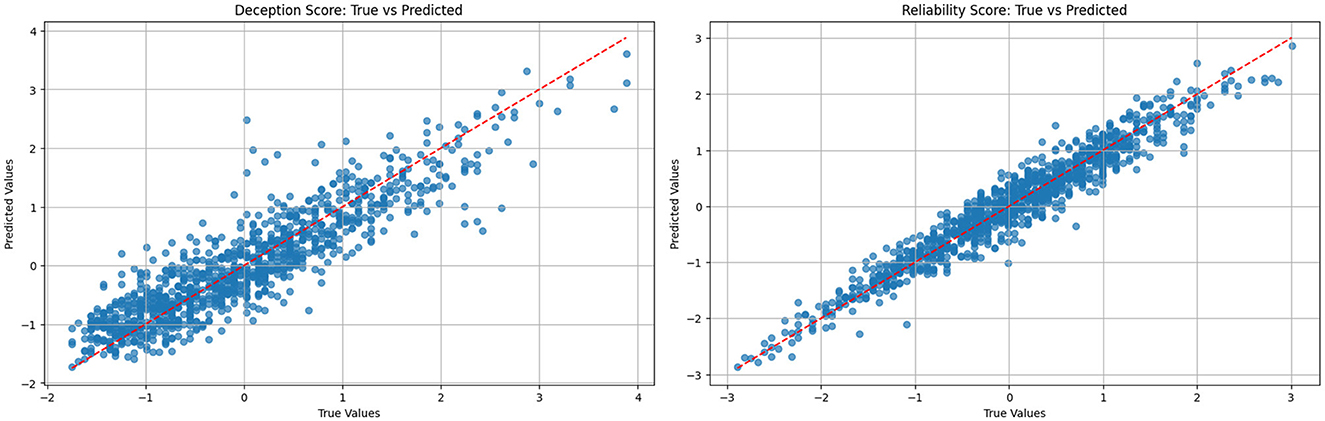Figure 11. Scatter plots showing predicted vs. actual values for deception and reliability scores using the XGBoost regression model. Both plots reveal a strong linear relationship with most points clustering around the diagonal, indicating accurate and consistent model predictions. (a) Deception score: true vs. predicted. (b) Reliability score: true vs. predicted.