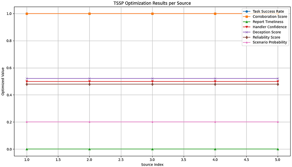 The TSSP model demonstrated robust optimization performance, returning feasible and optimal allocations across all defined behavioral scenarios. The convergence of the solver under constraints derived from ML predictions, such as task success rates, deception risk, and corroboration scores, confirmed the model's practical viability in real-world intelligence environments marked by uncertainty and limited observability.