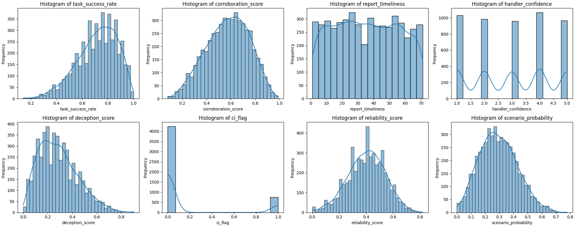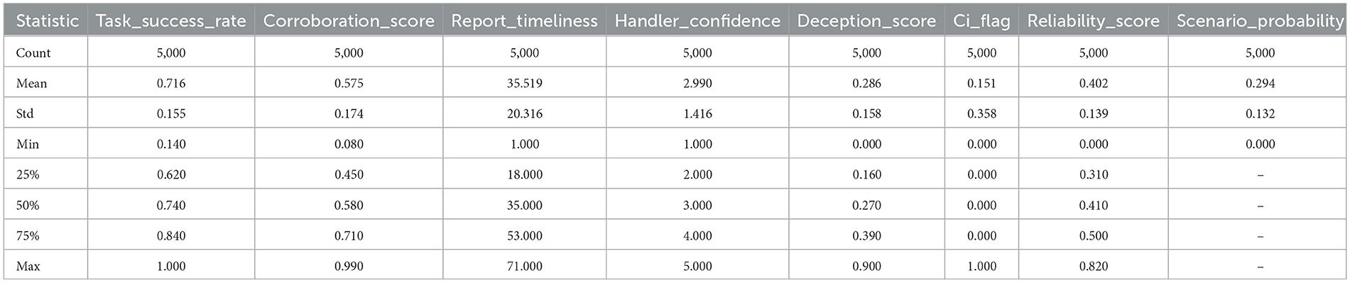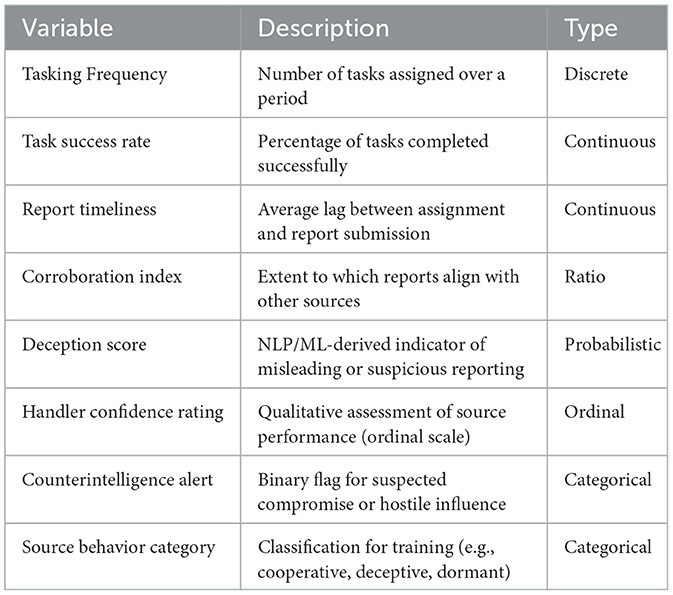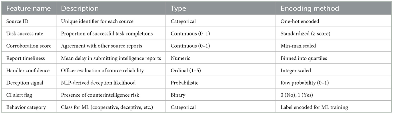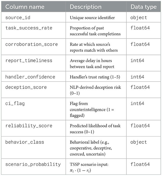 A simulation protocol involving three key stages was followed to ensure operational realism while maintaining security compliance. The first stage involved schema design, which involved defining the source profile schema to include features relevant to behavioral classification and tasking decisions. This was based on the empirical intelligence literature and known operational workflows (Lowenthal, 2020). The second stage involved feature engineering, where variables were encoded in structural formats to support downstream modeling, for example, binary flags, continuous reliability scores, and ordinal feedback ratings. The third stage was stochastic variation, which involved the introduction of controlled randomness to simulate uncertainty in source behavior, deception, and reporting outcomes that mirror real-world intelligence unpredictability (Zegart, 2022). Each row in the dataset represents a synthetic intelligence source profile, capable of being used for either ML training or scenario generation in TSSP. Table 4 summarises the set of features used in modelling intelligence source reliability.
