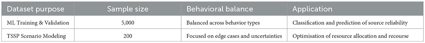 The synthetic sampling strategy is supported by both methodological necessity and precedent. In intelligence studies, researchers frequently rely on simulated environments to explore decision-making structures due to the classified nature of operational data (Treverton and Gabbard, 2008; Van Puyvelde et al., 2017). Moreover, behavioral modeling in cybersecurity and deception detection commonly uses simulated datasets to train high-risk classification models while ensuring ethical compliance (Pérez-Rosas et al., 2018). This approach ensures behavioral heterogeneity for training robust ML classifiers, availability of scenario diversity for probabilistic modeling, and ethical soundness and security compliance by avoiding sensitive personal data.