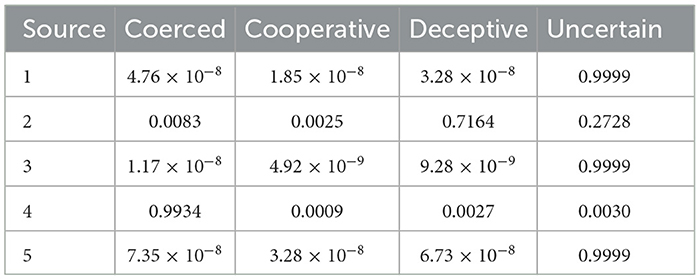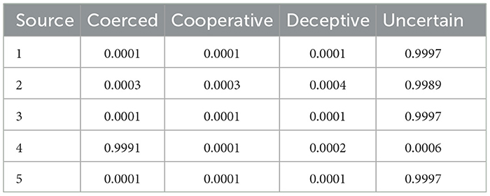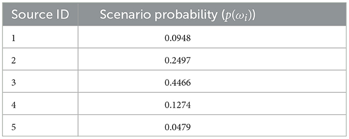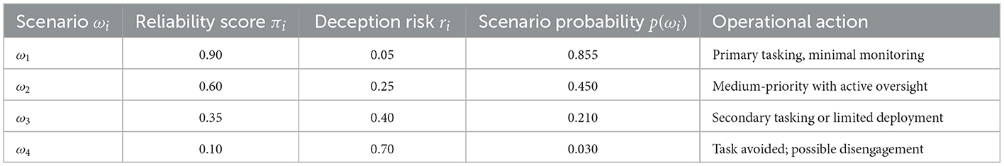 The regression outputs, that is, predicted reliability (πi) and deception risk (ri), were combined to compute scenario probabilities for the TSSP model using the formula denoted in Equation 8. These probabilities represented the likelihood that a given source would perform reliably and truthfully. They were used in the first stage of the TSSP model to guide initial tasking decisions. In the second stage, if the predicted outcome deviated from what occurred in a scenario, the model could adjust through reallocation or source disengagement, mimicking adaptive operational planning.