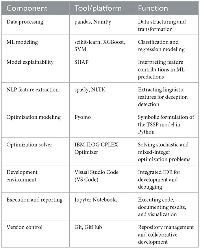 The ML component utilized Python-based libraries for data processing and scikit-learn, XGBoost, and SVM for supervised learning. These models were used for both classification, for instance, behavioral categorization, and regression, for instance, reliability and deception probability estimation. SHAP was employed for model interpretability, enabling feature attribution analysis essential in intelligence applications. Further, the natural language features were extracted using spaCy and NLTK, supporting the detection of linguistic patterns that may indicate deception. These features were incorporated into the ML models to enhance behavioral risk prediction. On the other hand, the TSSP model was developed using Pyomo, a Python-based modeling language. The optimization problem was solved using IBM ILOG CPLEX Optimizer, selected for its high performance and compatibility with scenario-based and mixed-integer formulations. All code execution and result visualization were managed in Jupyter Notebooks, with Git-based repository tracking used to maintain version history and ensure consistent workflow documentation. Table 6 is a summary of the key tools and platforms employed throughout the study. To support transparency and reproducibility, all scripts and documentation would be made publicly available in GitHub repository.