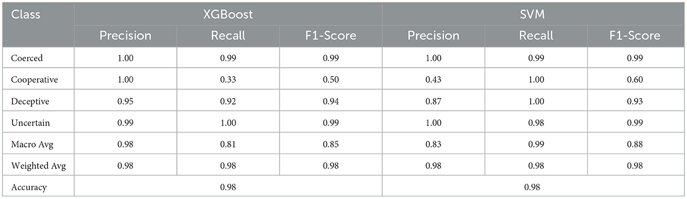 The ML classification models, that is, XGBoost and SVM, demonstrated high performance, achieving an overall accuracy of 98% following application of SMOTE. This preprocessing step effectively mitigated class imbalance, a common challenge in behavior datasets, thereby enhancing the ability of the model to generalize across all behavior categories. Notably, XGBoost achieved higher macro precision, indicating strong reliability in predicting the dominant classes with fewer false positives. Conversely, the SVM model exhibited superior recall for underrepresented behavioral categories such as 'cooperative', which are often overlooked in imbalanced data environments. This trade-off between precision and recall highlights key operational considerations: while XGBoost provides balanced robustness across diverse behaviors, the SVM may be more suitable for mission-critical scenarios where detection rate and strategically important traits, such as high-trust or deception-averse source, are prioritized.