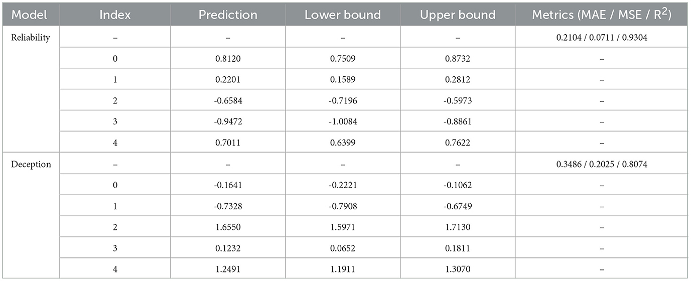 The regression models developed to estimate source reliability and deception scores demonstrated strong predictive capabilities, with R2 values of 0.93 and 0.81, respectively. These metrics indicate that the models effectively captured patterns in the input data and could explain most of the variation in the scores being predicted. This was further demonstrated in Figure 11, where scatter plots of predicted versus actual values for deception and reliability scores from the XGBoost regression model showed a strong linear relationship, with most points clustered around the diagonal, indicating accurate and consistent predictions. Equally, sources with higher predicted reliability also tended to have higher task success rates, showing a close alignment between the regression outputs and real-world operational outcomes. In contrast, deception scores showed a clear negative association with scenario probabilities.