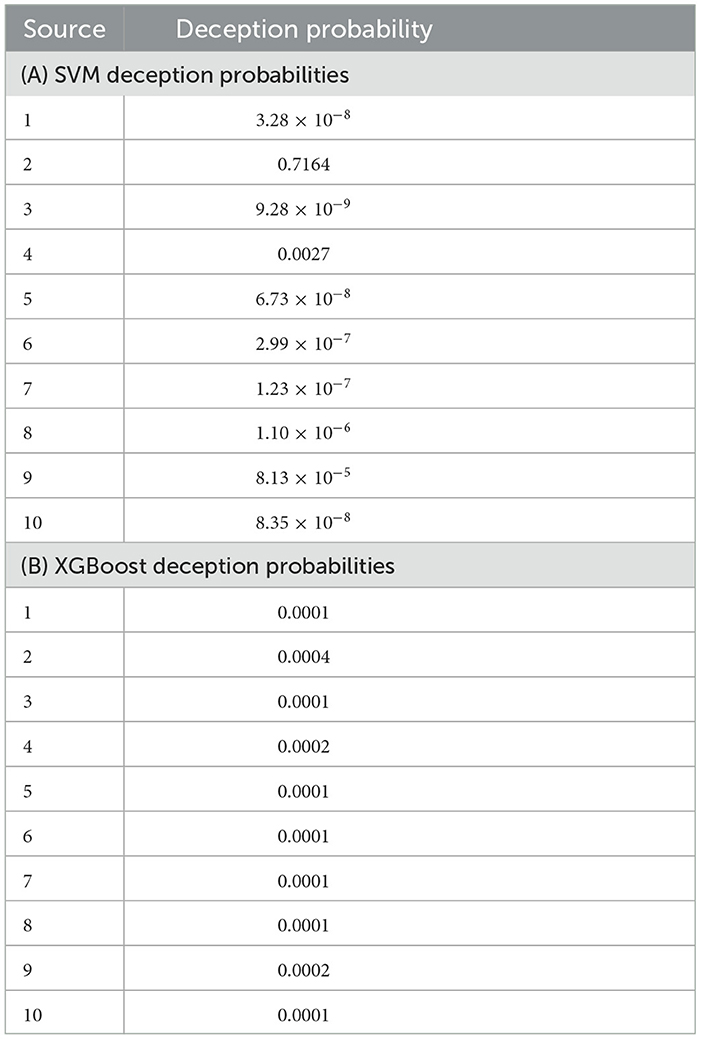 Outputs from the ML models, particularly the predicted source reliability πi, deception probability ri, and predicted class labels, were used to construct scenarios ω ∈ Ω for the TSSP model. Each scenario represents a hypothetical realization of source behavior, with an associated p(wi) derived from Equation 8. This formulation assumed that the probability of successful and truthful tasking is a function of both reliability and deception risk. These scenario probabilities were mapped to cost and reward structures in the TSSP model, as illustrated in Table 5, influencing both the first-stage (pre-tasking) and second-stage (recourse/adjustment) decisions. This mapping enables the TSSP model to quantify uncertainty in tasking decisions and allocate resources accordingly.