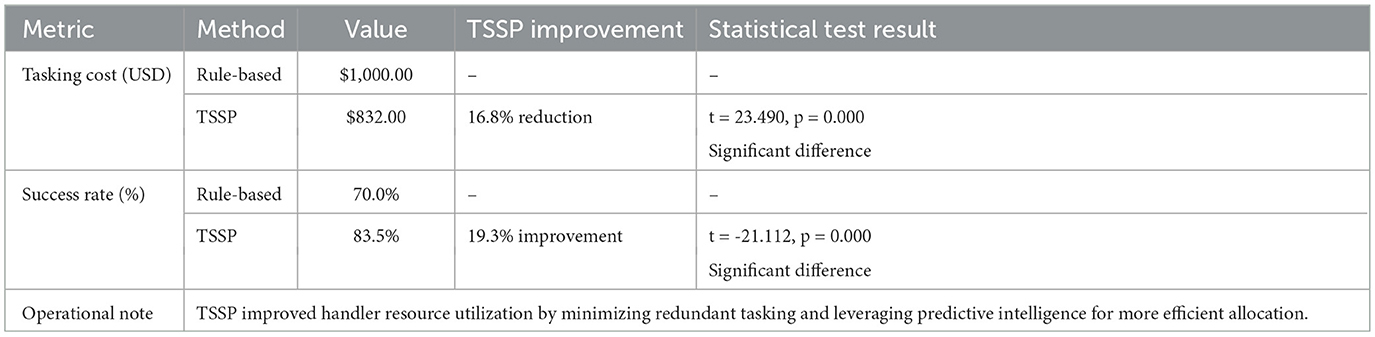 The sensitivity analysis revealed that the TSSP model consistently outperformed the rule-based system across variations in tasking cost and success rate thresholds. As shown in Figure 10, the TSSP maintained lower tasking costs even at elevated cost levels, remaining below the $1,000 benchmark. At baseline, it achieved a 16.8% cost reduction ($832 vs. $1,000). This indicates that the model adapts efficiently under budget constraints by prioritizing high-value, reliable sources. Similarly, mission success rates improved under the TSSP model across all tested scenarios. At the baseline threshold, it achieved 83.5% success compared to 70% in the rule-based system, an increase of 19.3%. This gain reflects the model's ability to optimize assignments based on predicted reliability and deception scores. Handler resource use was also streamlined through optimized task distribution, enhancing operational efficiency. This confirms that TSSP not only improves source performance management but also sustains robustness under uncertainty.