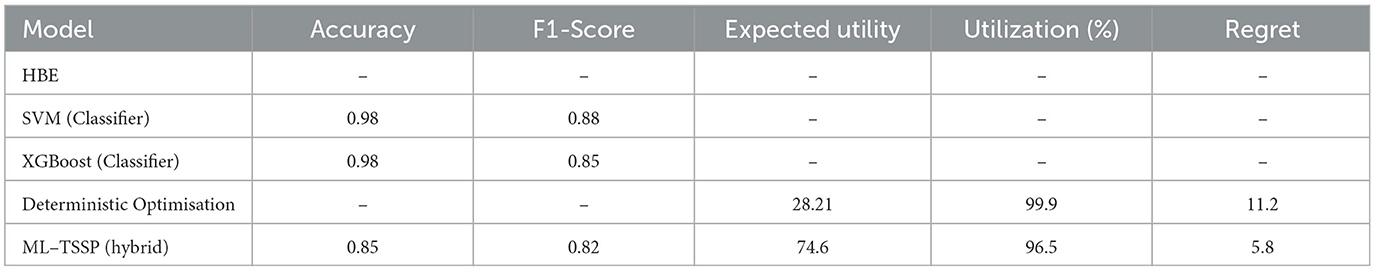 Table 16 compares the proposed ML–TSSP framework with the defined baselines described in Subsection 3.5. The standalone ML models (XGBoost and SVM) achieved high predictive accuracy (0.98) on a SMOTE-balanced dataset, with XGBoost showing more consistent performance across classes. The deterministic optimisation baseline, implemented in CVXPY and assuming perfect foresight, selected 45 of 200 sources, achieving an expected utility of 28.21 with 99.9% budget utilization. In contrast, the ML–TSSP hybrid, integrating XGBoost predictions with stochastic resource allocation, delivered a substantially higher expected utility (74.6), maintained high utilization (96.5%), and reduced regret (5.8), indicating superior decision robustness under uncertainty.