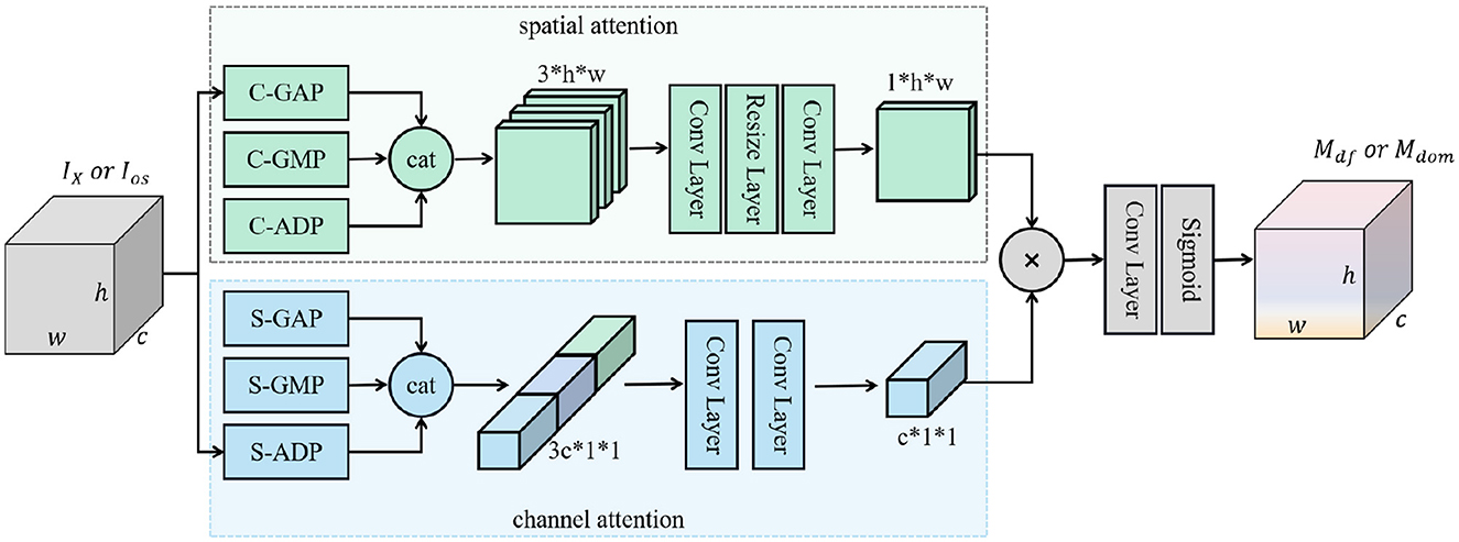 Figure 3. Architecture of the deepfake (domain) attention network. This network takes the face information IX (deepfake-irrelevant information Ios) as input and then learns to produce an attention map that highlights the significance (potential) of the input data being correlated with deepfake-relevant (domain-relevant) information. “cat” means concatenating all input data along the channel dimension; ⊗ represents the Hadamard product; “C-GAP,” “C-GMP,” and “C-ADP” represent cross-channel global average pooling, cross-channel global max pooling, and cross-channel adaptive pooling, respectively; “S-GAP,” “S-GMP,” and “S-ADP” are cross-spatial global average pooling, cross-spatial global max pooling, and cross-spatial adaptive pooling, respectively.