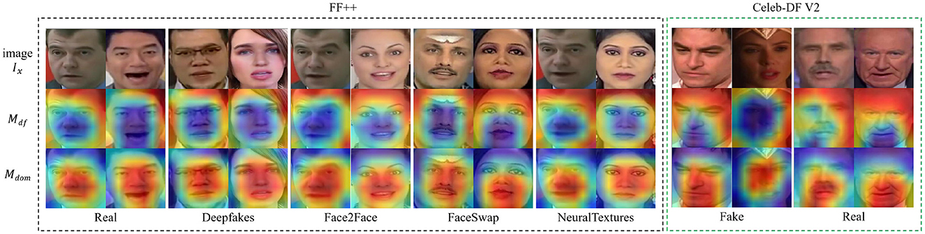 Figure 6. Visualization of the real/fake attention map Mdf and the domain (forgery technique) attention map Mdom on the FF++ and CDF2 datasets (images adapted with permission from Rossler, A., 2019, https://www.kaggle.com/datasets/xdxd003/ff-c23, licensed under CC-BY-NC, and from Li Y., 2020, https://www.kaggle.com/datasets/reubensuju/celeb-df-v2, licensed under CC-BY). We can see that Mdom captures the forgery technique-related information (e.g., the forged region) while Mdf focuses on the information invariant to forgery techniques.