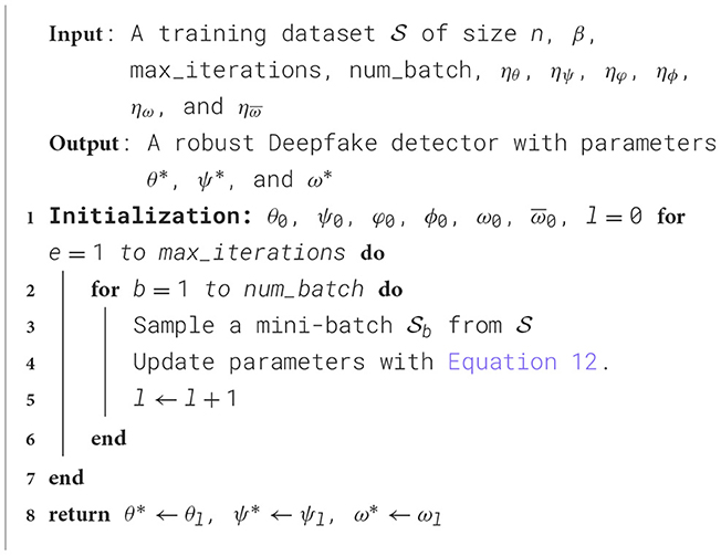 where is defined on , ηθ, ηψ, ηφ, ηϕ, ηω, and are learning rates, and , , , , , and are the (sub)gradient of with respect to θ, ψ, φ, ϕ, ω, and . In the testing phase, we only use the feature extractor G, attention module Adf, and the deepfake classification module C. The pseudocode is shown in Algorithm 2.
