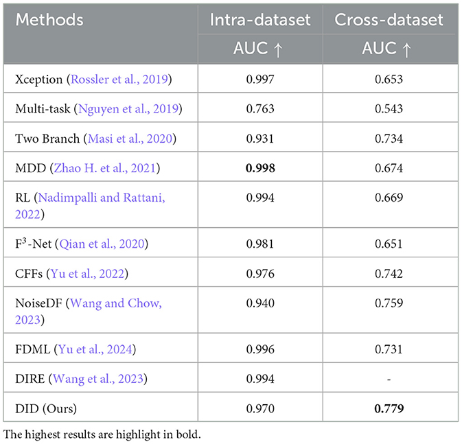 We assess the detection performance of our proposed method, DID, in the intra-dataset scenario, where both the training and testing datasets are derived from the FF++ dataset and are disjoint from one another. Table 1 presents the results of the intra-dataset evaluation along with comparisons to the baseline methods. We can see that our method achieves 0.970 on AUC, surpassing the performance of Multi-task (Nguyen et al., 2019), Two Branch (Masi et al., 2020), and NoiseDF (Wang and Chow, 2023) methods. Additionally, it demonstrates competitiveness with the leading performance, which is an AUC score of 0.998 attained by the MDD method (Zhao H. et al., 2021).