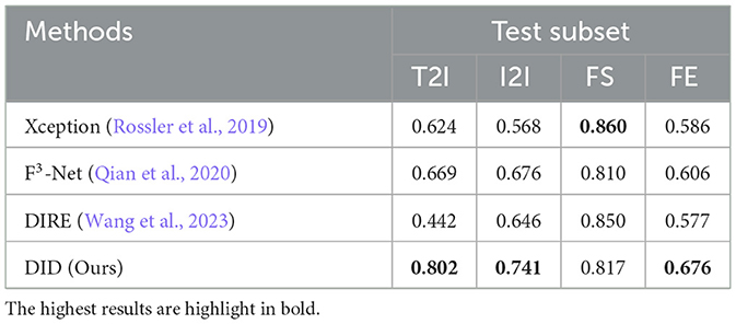 Table 2 shows the performance comparisons with three widely used detectors [their results are cited from Cheng et al. (2024)]. It is clear from the table that our proposed DID method achieves remarkable generalization performance on the diffusion-generated facial forgery dataset. DID exceeds the competitor detectors by a large margin on the facial forgery dataset generated with T2I, I2I and FE diffusion techniques. For instance, DID exhibits advantages over DIRE (Wang et al., 2023) which is specifically designed for deepfake detection of diffusion technique-generated images by 81.45% (for T2I), 12.82% (for I2I), and 17.16% (for FE), respectively. Additionally, DID is highly competitive on the forgery dataset generated with FS diffusion technique. These results further demonstrate the superiority of our DID method.