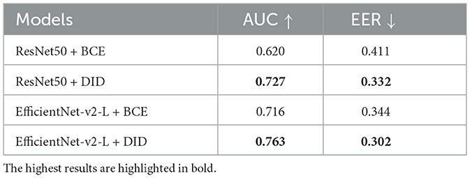 As shown in Table 3, DID consistently achieves performance improvement across all backbones fine-tuned with the BCE loss. Notably, it achieves a 17.26% gain in AUC (0.727 vs. 0.620) and a 19.22% improvement in EER (0.763 vs. 0.716) compared to the ResNet-50 backbone. With EfficientNet-V2-L as the backbone, the improvements are 6.56% (0.763 vs. 0.716) on AUC and 12.21% (0.302 vs. 0.344) on EER. These results demonstrate the applicability of our method across different datasets and various feature extraction backbones in the context of cross-dataset deepfake detection.