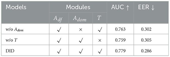 To investigate the significance of the domain attention module Adom and the decorrelation learning module T, we conducted ablation experiments by training the proposed DID framework with each module removed individually. The detection performance of these models is presented in Table 4. From the results, we observe that when the domain attention module Adom is excluded from the DID framework (denoted as “w/o Adom” in Table 4), the AUC score drops by 2.05% (from 0.779 to 0.763) and the EER increases by 5.59% (from 0.286 to 0.302) compared to the complete DID model. Moreover, when the decorrelation learning module T is removed (denoted as “w/o T” in Table 4), the AUC decreases to 0.759, and the EER rises to 0.305, leading to a more significant performance drop than the model without Adom. Specifically, the AUC score decreases by 2.57%, and the EER increases by 6.64%. These results emphasize the necessity of both the Adom and T modules in ensuring the robustness and effectiveness of the DID framework.