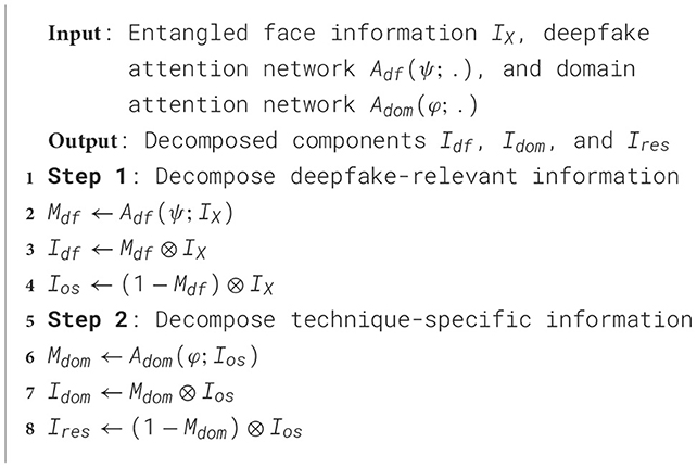 Motivated by Yang et al. (2021), the information decomposition module consists of a deepfake attention network Adf parameterized by ψ [denoted as Adf(ψ; .)] and a domain attention network Adom parameterized by φ [denoted as Adom(φ; .)], as shown in Figure 2. Taking the face information IX embedded with entangled information as input, the deepfake attention network focuses on deepfake-relevant information, thereby it decomposes IX into two complementary components: the deepfake-relevant information Idf and the deepfake-irrelevant information Ios. This process can be formulated as follows,