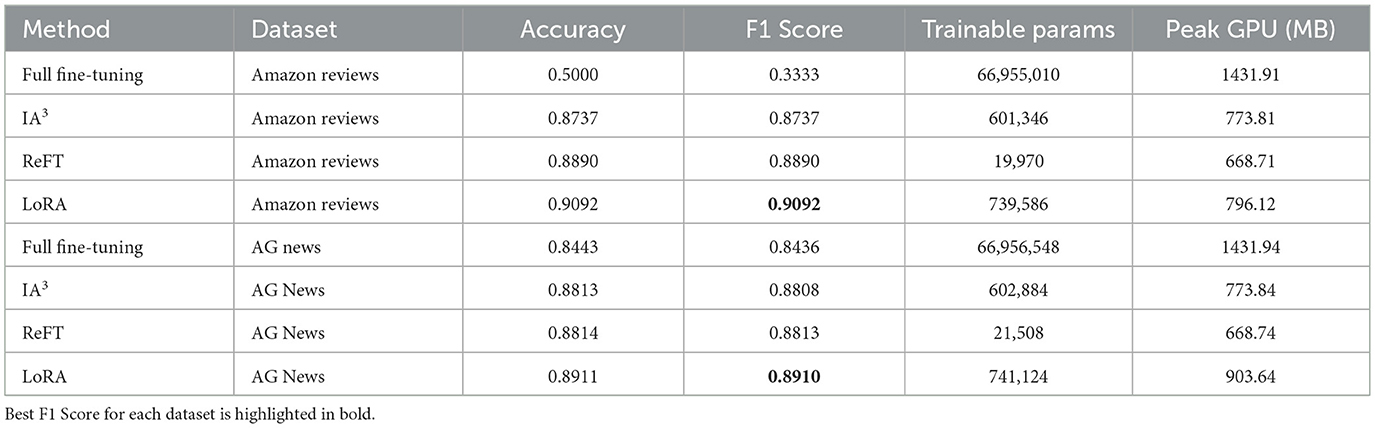 Table 1 presents the consolidated results from all eight experimental runs, detailing the final F1 score, accuracy, trainable parameter count, and peak GPU memory usage for each method on both the Amazon Reviews and AG News datasets.