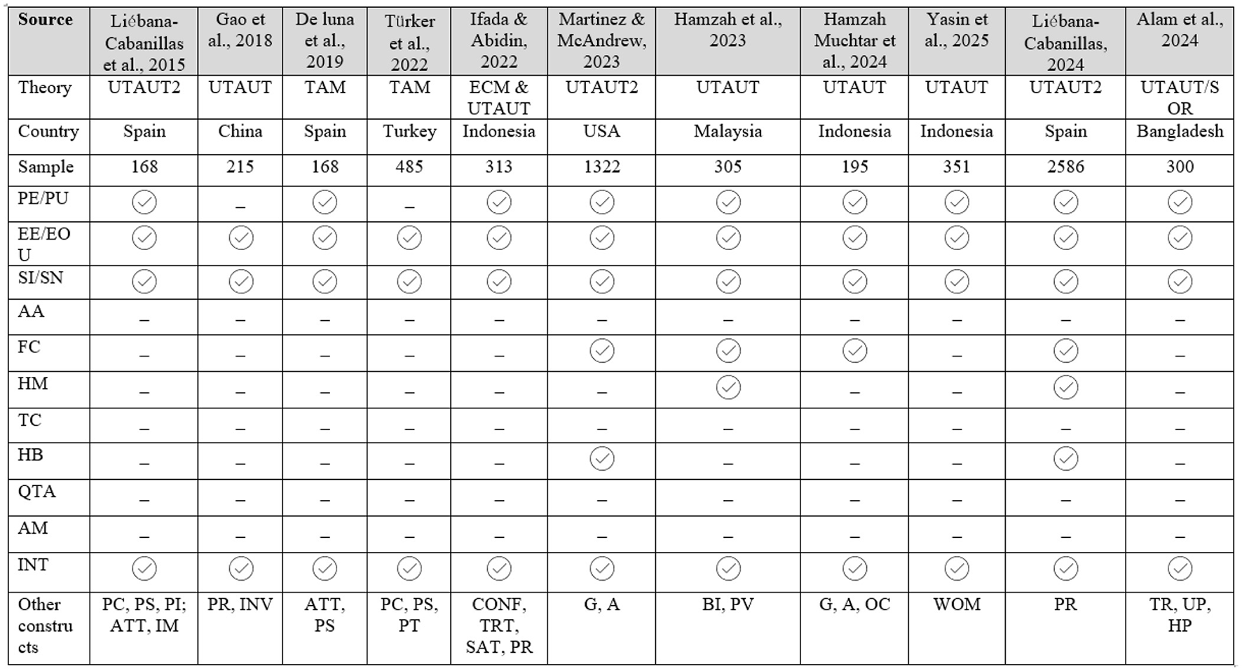 Several researchers have examined users' intention and behaviors by employing multiple theories such as UTAUT, UTAUT2, TAM, TPB, etc (refer Figure 1). However, their studies were mostly conducted in developed countries context, which was unable to address least development country issues. Hence, this study employs a modified UTAUT2 model to measure the sustained usage intention of QR payments particularly in developing country context. By doing so, this study seeks to address the second research gap. Prior research on mobile payment adoption has predominantly emphasized facilitating factors, with limited attention given to inhibiting factors (refer Figure 1). This study seeks to address this imbalance by incorporating both enabling and constraining elements, thereby offering a more holistic understanding of the determinants of continuous usage intention and find the third research gap. Finally, this study also provides an novel insight of moderating role of AA and QTA, providing a new direction of post-adoption literature.