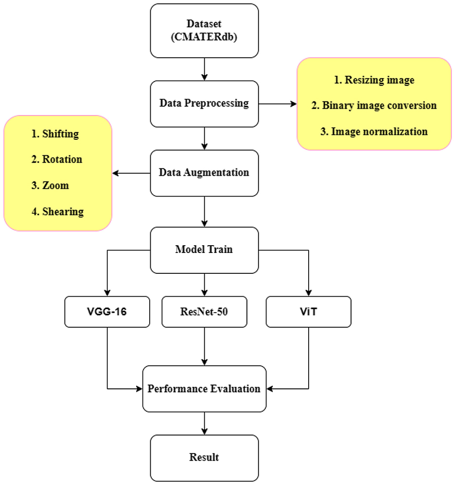 Figure 1 provides a visual representation of the entire methodology. The subsequent sections will delve into each of these steps in more detail. The process begins with the CMATERdb 3.1.2 dataset, which is subjected to various preprocessing steps to prepare it for the subsequent stages. The preprocessing and augmentation phase includes several techniques such as shifting, rotation, zooming, and shearing. These techniques help to increase the diversity of the data, thereby improving the robustness of the models. Additionally, the images are resized, converted to binary format, and normalized to ensure uniformity and to facilitate efficient processing. Following data preprocessing and augmentation, we train three different models: VGG16, ResNet50, and ViT. Each of these models has its unique strengths and contributes to the overall performance of our system. After training, we measure the performance of each model. The performance metrics include training and validation accuracy, which provide insights into the effectiveness of each model in recognizing Bangla handwritten characters.