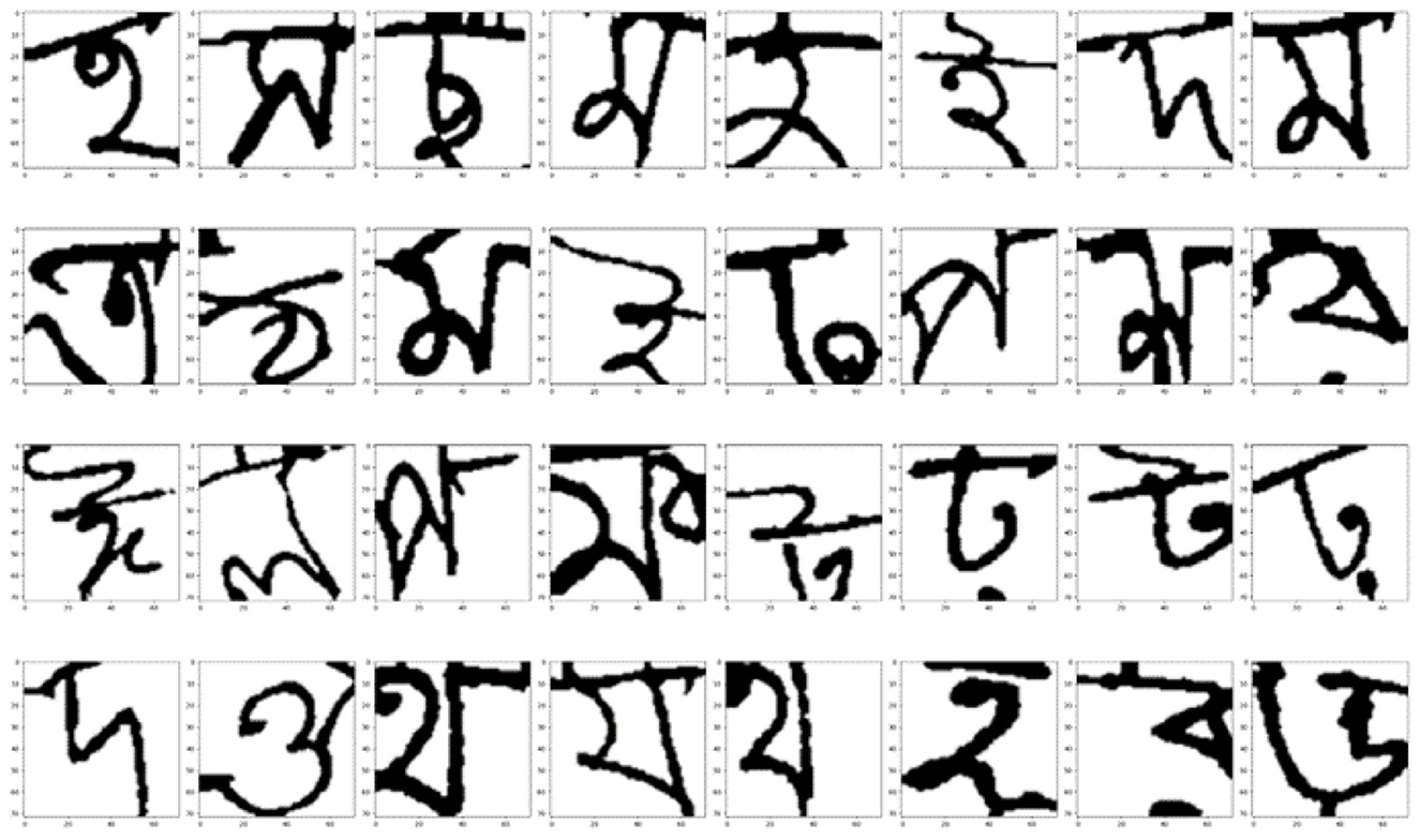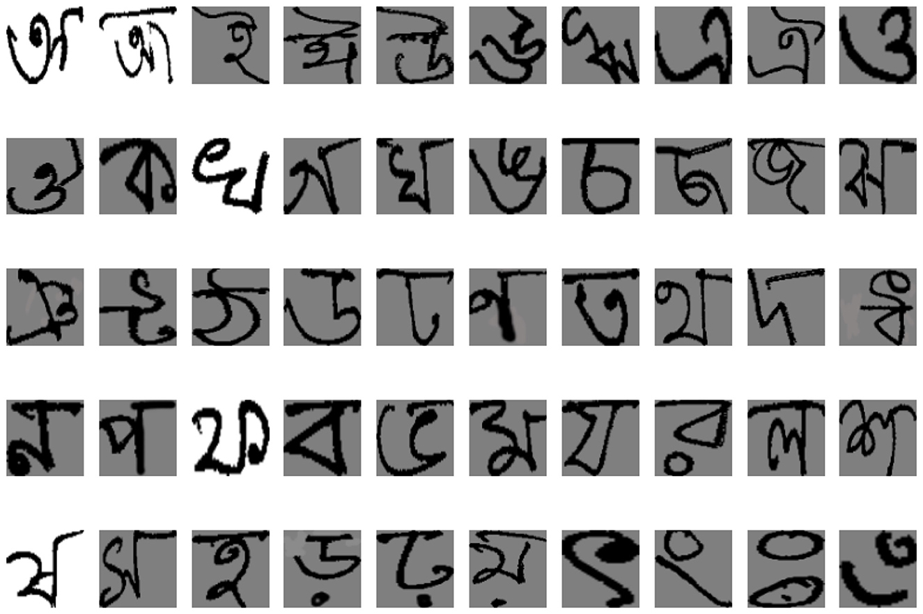 The Center for Microprocessor Applications for Training Education and Research (CMATER) lab at Jadavpur University, India, developed CMATERdb, one of the earliest databases for handwritten Bengali alphabets. Among its versions, CMATERdb 3.1.2 contains 24,000 images of 50 distinct Bengali basic characters, making it suitable for Bangla handwritten character recognition (Sarkar et al., 2012). The dataset is well-balanced, with a sufficient number of samples per class, and has been widely used in prior research, providing a reliable benchmark for model comparison. Figure 2 shows a random image from all 50 classes.