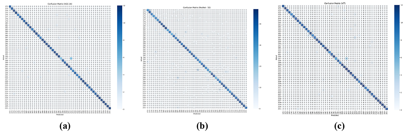 While our primary evaluation metrics are accuracy, precision, recall, and F1-score, we also present per-class performance via confusion matrices shown in Figure 4 to provide detailed insight into model behavior for each character. These analyses highlight classes with higher misclassification rates and allow a focused interpretation of the strengths and weaknesses of each model. It is observed that the ViT model achieves the highest per-class accuracy with fewer misclassifications compared to VGG16 and ResNet50, indicating better generalization on the CMATERdb dataset.