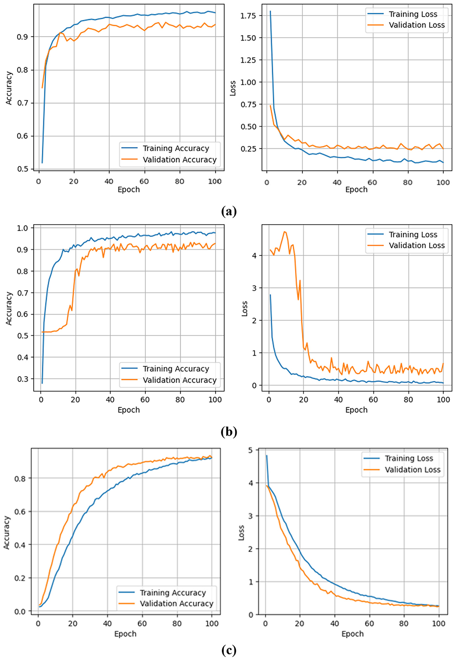 Figure 5. Training and validation accuracy and loss curves for (a) VGG-16, (b) ResNet-50, and (c) Vision Transformer models on the CMATERdb 3.1.2 dataset.