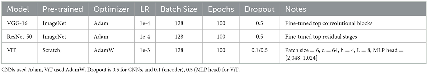 • Vision Transformer (ViT): Patch size = 6, embedding dimension = 64, 12 transformer layers, 8 attention heads, AdamW optimizer with weight decay 0.01, batch size 32, learning rate 0.0001, trained for 100 epochs.