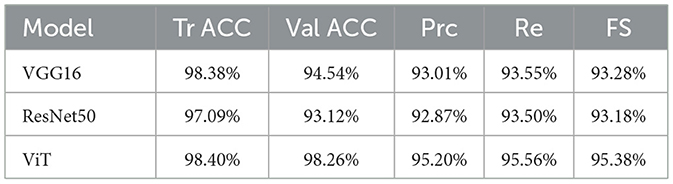 The VGG-16 model achieved a training accuracy of 98.38% and a validation accuracy of 94.54%. The ResNet-50 model yielded 97.09% training accuracy and 93.12% validation accuracy. In contrast, the ViT outperformed both CNN-based models, achieving 98.40% training accuracy and 98.26% validation accuracy.