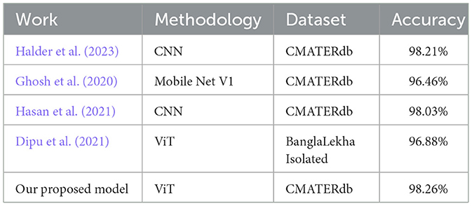Table 3 describes a comparison with some existing works and our work. The ViT model surpasses both VGG16 and ResNet50, achieving the highest validation accuracy of 98.26%. This slightly exceeds the best-reported accuracy of 98.21% by Halder et al. (2023) using a CNN model. The training accuracy of ViT is also the highest at 98.40%, indicating robust learning capability and a small gap between training and validation accuracy, which suggests good generalization ability. VGG16 and ResNet50 also demonstrate competitive performance with training accuracies of 98.38% and 97.09%, and validation accuracies of 94.54% and 93.12%, respectively. VGG16 exhibits slightly superior performance on the CMATERdb dataset compared to ResNet50. Table 3 provides a comparison of our work with previous studies. The ViT outperforms the state-of-the-art models. This underscores the effectiveness of the Vision Transformer model in the task of Bangla handwritten character recognition. In conclusion, the Vision Transformer model exhibits outstanding performance on the CMATERdb dataset, making it a promising model for Bangla handwritten character recognition.