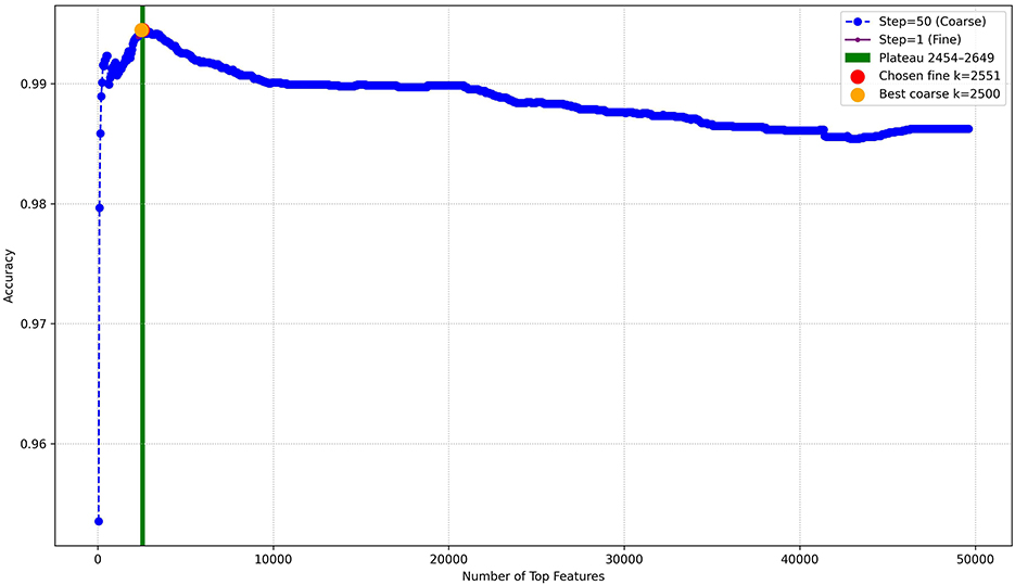 Fine search: a detailed search was then performed around the preliminary best k (±200 features) with a step size of 1 to more precisely examine performance trends. Instead of focusing on a single value of k, this step revealed a plateau region, where multiple consecutive k values achieved the same maximum accuracy. This plateau indicates that the model's performance is stable across that range, allowing flexibility in choosing k without sacrificing accuracy. Highlighting this plateau ensured that the final feature set was not restricted to a single arbitrary cutoff but rather selected from a range of equally optimal feature counts. This balances informativeness and size, enhancing classification accuracy while keeping computational demands manageable. The process was visualized by plotting accuracy against the number of selected features for both the coarse and fine searches, with the plateau region shaded to clearly show the stability zone for top-k features.
